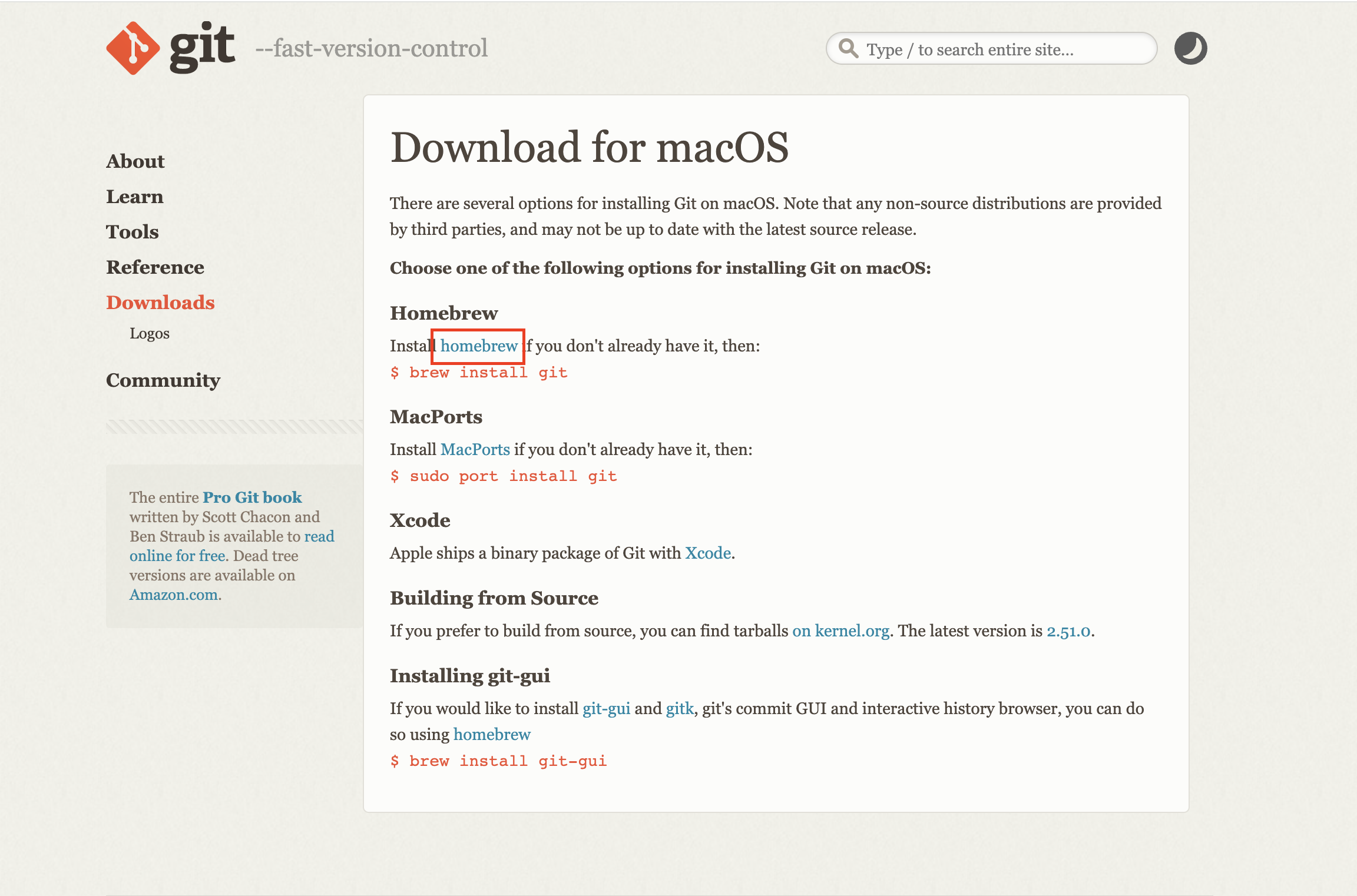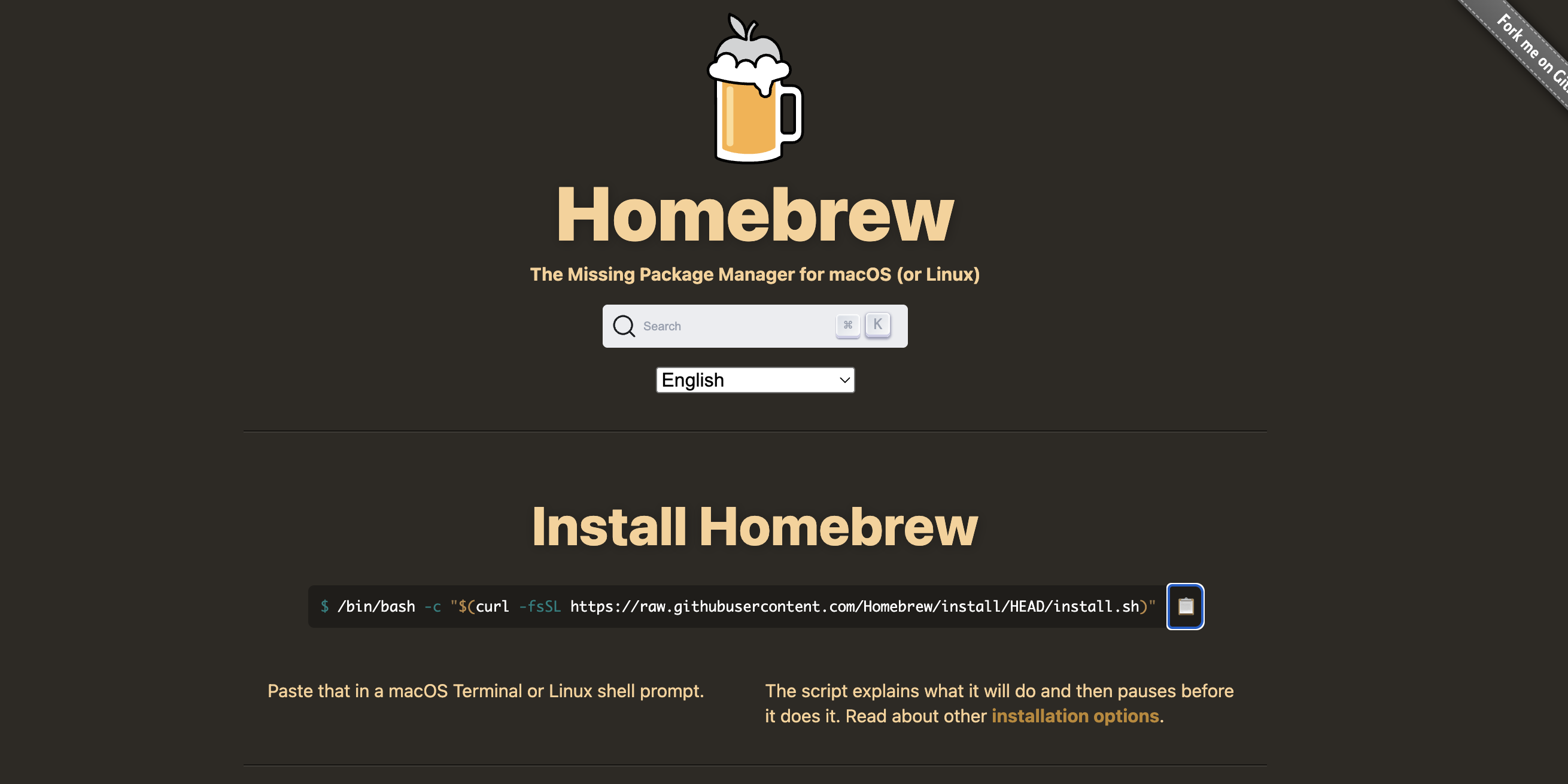 같은 페이지에서 Homebrew 설치를 위한 링크를 찾아 클릭합니다.